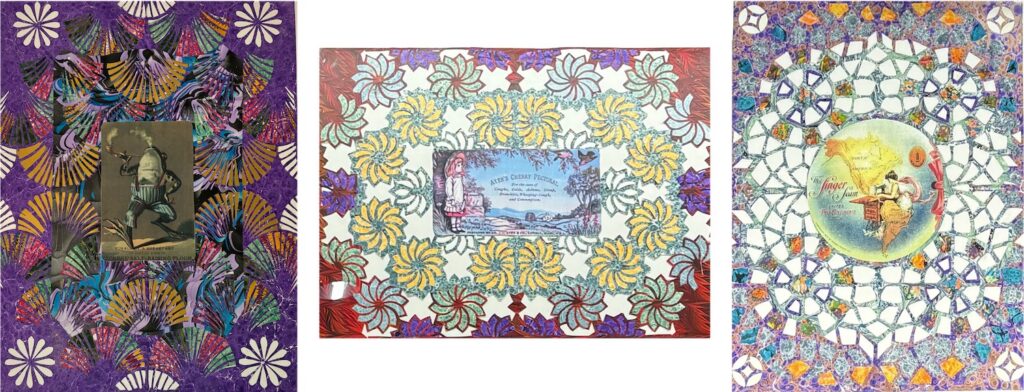 At the heart of each composition lies a “trade card,” which was a form of commercial advertising popular during the Victorian Era. Rather than overshadowing these vintage images, Aaron’s ornate borders are designed to enhance them. The result is a harmonious blend of old and new, where historical imagery is elevated through contemporary craftsmanship. As Aaron describes it, he is “creating art from art.”